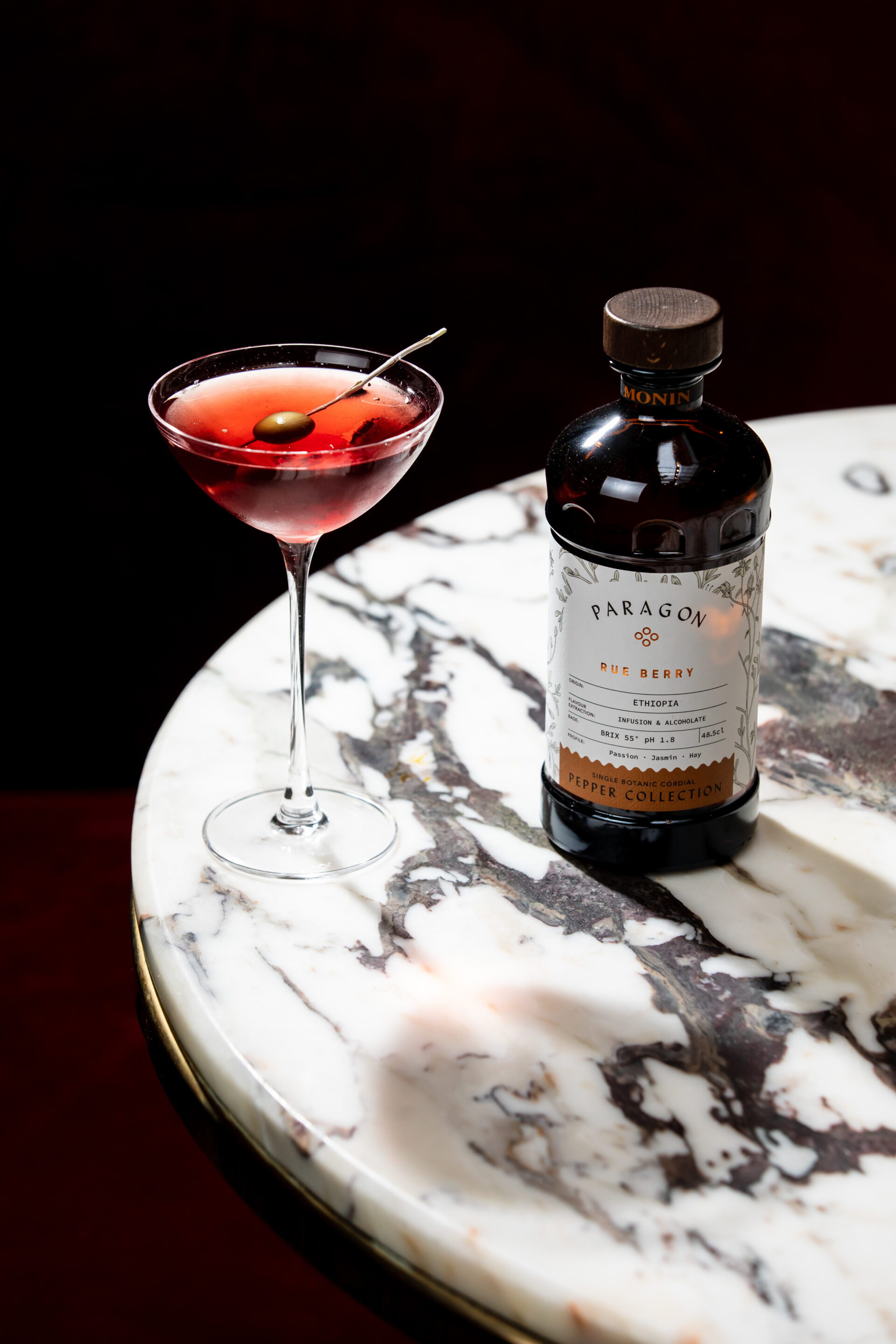 Stir. Pour into a coupette glass. Garnish with a Nocellara Olive. Serve.