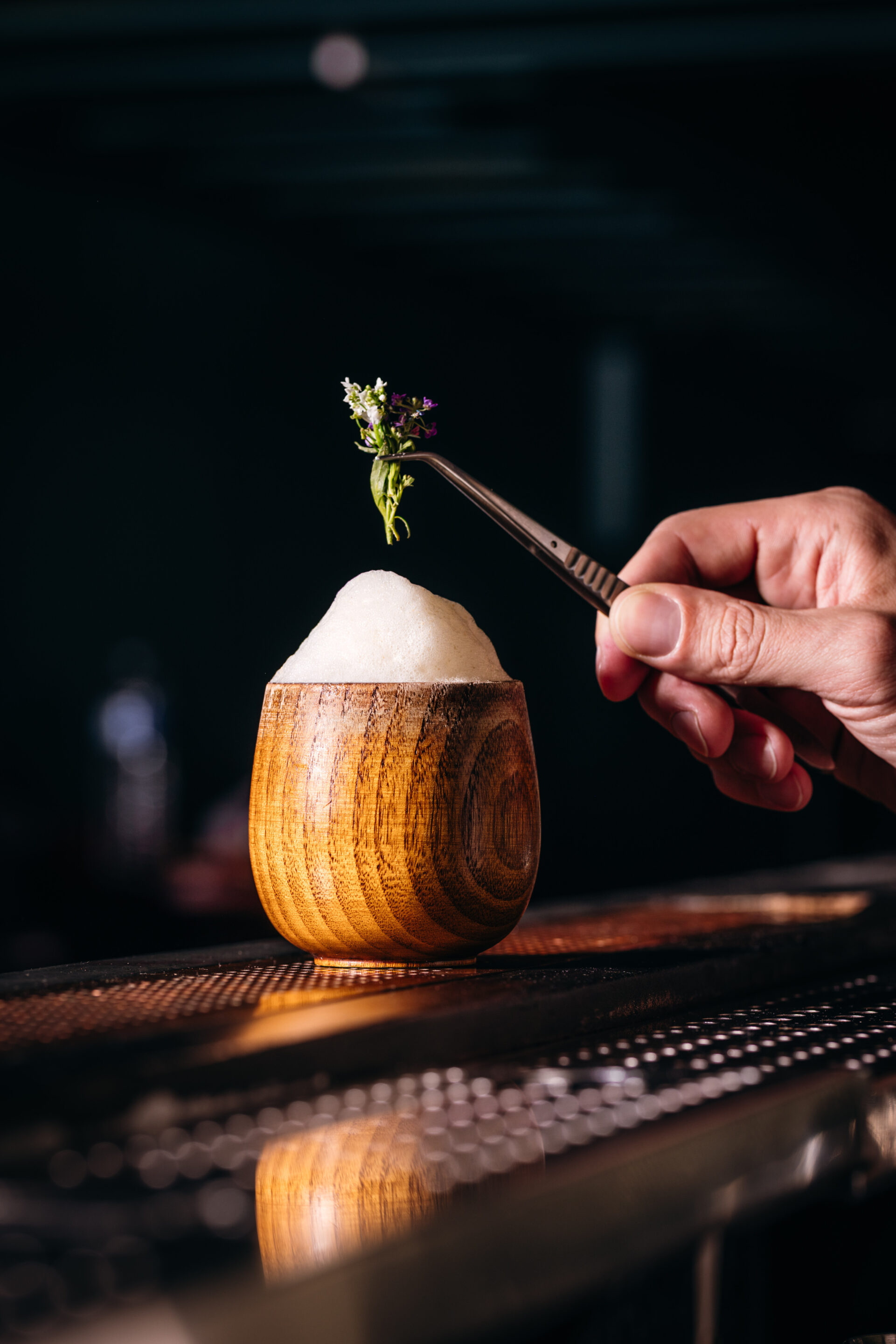 Pour all ingredients into wooden cup with clear ice cubes. Stir gently. Top with fenugreek air. Garnish and serve.