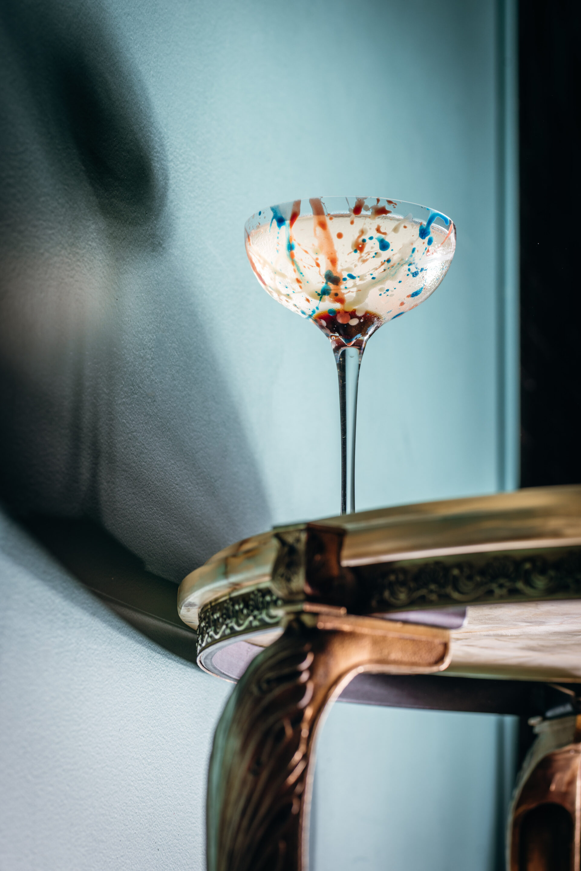 Start by adding strokes of coloured cocoa butter inside the glass. Leave to dry. Pour all ingredients in a stirring glass, stir well and strain in a chilled Nude Coupette glass. Garnish and serve.