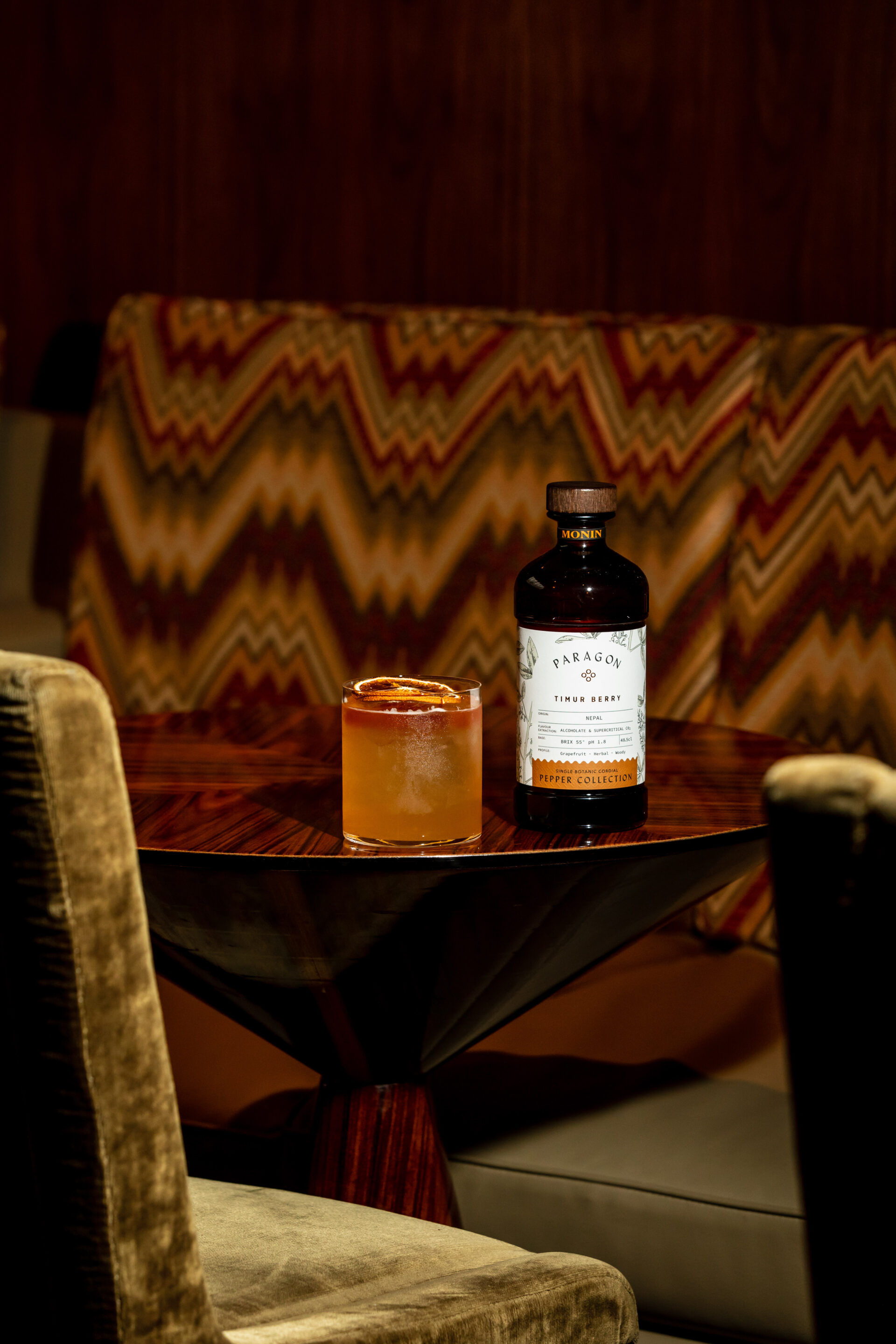 Verser sur des glaçons dans un verre à whisky tous les ingrédients. Ajouter quelques gouttes de bitter. Décorer et servir.